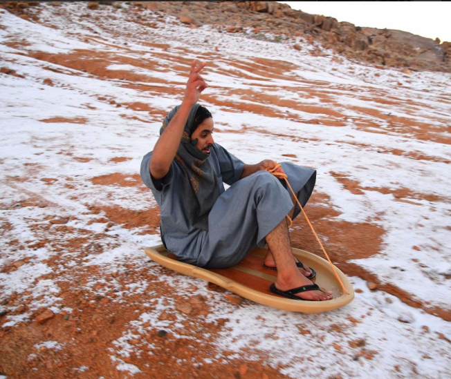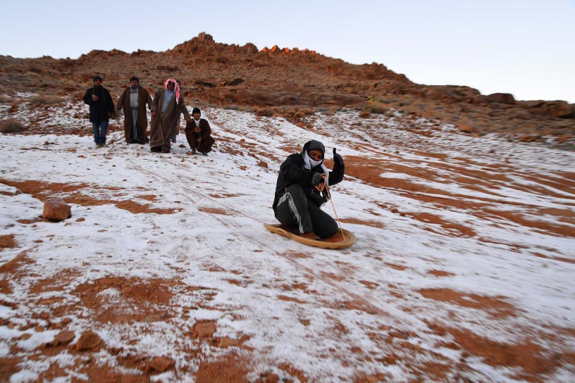 На фотографиях в соцсетях видно, как бедуины в традиционных длинных рубахах (галабеях), укутавшись в головной платок (куфия), скатываются по склонам на самодельных "ледянках" и даже устраивают соревнования.