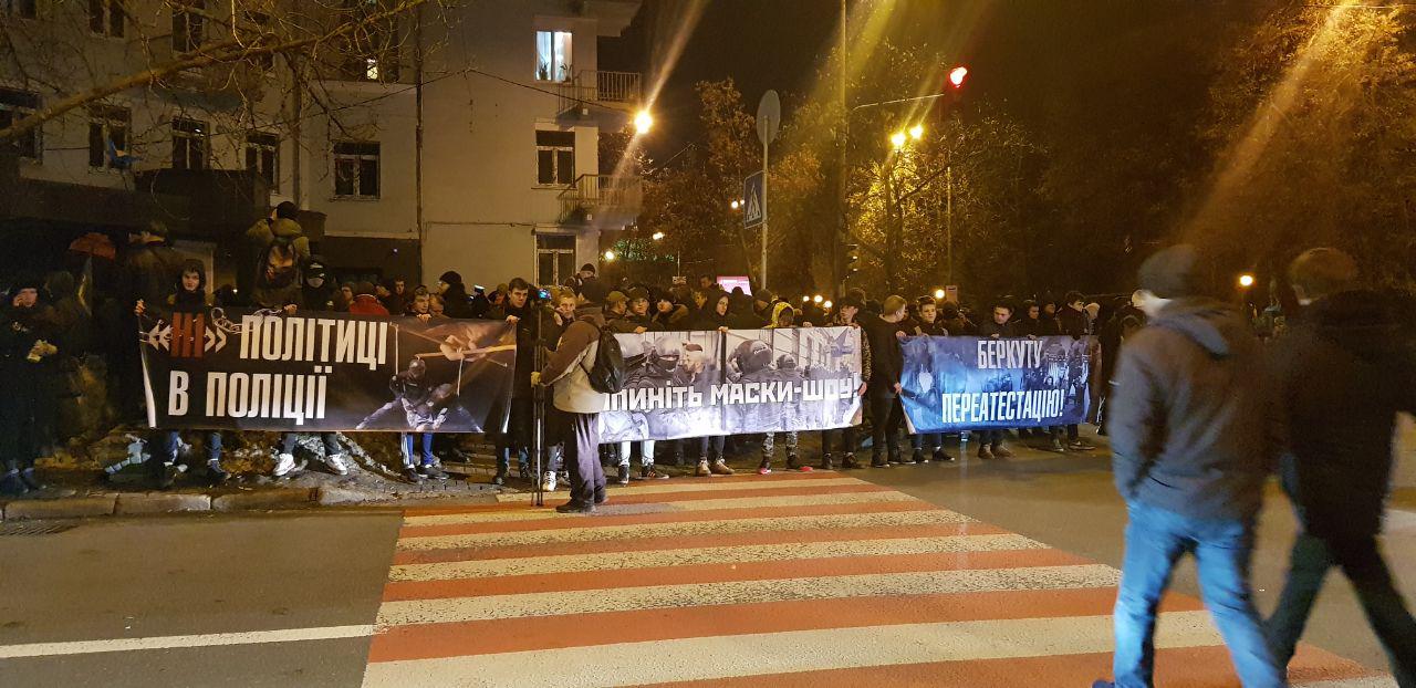Сегодня вечером националисты прошлись маршем к зданию МВД. Это акция, приуроченная к драке С14 и полиции под зданием Подольского райотдела 9 февраля. Тогда один из спецназовцев крикнул "Ложись, Бандера!".