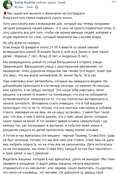 Инцидент случился вечером в понедельник, 18 февраля, на улице Ольшанской в Киеве. Она с мужем и тремя детьми около 21:00 возвращалась домой. Машина ехала по Ольшанской в сторону Зверинецкой. "Ольшанская - улица с двусторонним движением, но неширокая, плюс дорожное покрытие там таково (кто ездил, знает про эти ямы), что мы ехали километров 20, может быть, 30 в час", - рассказывает София.