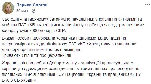 "Указанные лица подстрекали руководителя предприятия к предоставлению неправомерной выгоды ликвидатору ПАО "КБ "Хрещатик" за заключение договора аренды нежилых помещений. Ведутся следственные и процессуальные действия", - написала Сарган.