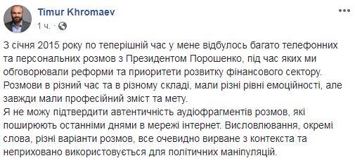 Глава Нацкомиссии по ценным бумагам Тимур Хромаев назвал политической манипуляцией обнародованный в сети журналистом Александром Дубинским аудио-файл, где голос, похожий на президента Петра Порошенко, спрашивает у голоса, похожего на  Хромаева: "Где тебе, @лядь еще, Тимур, реформ не хватает?" Об этом он сообщил у себя на странице в Facebook.