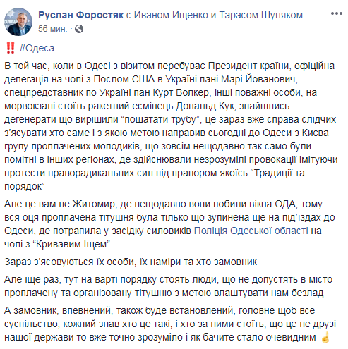 "В то время, когда в Одессе с визитом находится президент страны, официальная делегация во главе с послом США в Украине госпожа Мари Йованович, спецпредставитель по Украине господин Курт Волкер, другие важные лица, на морвокзале стоит ракетный эсминец Donald Cook, нашлись (люди, - прим. ред.), которые решили "пошатать трубу". Это сейчас уже дело следователей выяснить, кто именно и с какой целью направил сегодня в Одессу из Киева группу проплаченных молодчиков, которые совсем недавно также были замечены в других регионах, где совершали непонятные провокации, имитируя протесты праворадикальных сил под флагом какой-то "Традиции и порядка", - написал Форостяк.