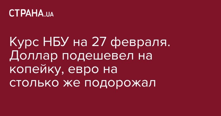 Нацбанк Украины (НБУ) установил официальный курс основных валют по отношению к гривне на среду, 27 февраля. Сегодня курс доллара составил 26,98 грн/доллар, что на 1 копейку ниже по сравнению с предыдущим банковским днем. Об этом свидетельствует информация на сайте регулятора.