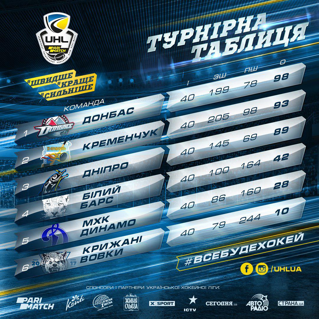"Донбасс" выигрывает регулярный чемпионат, набрав 98 очков. "Кременчук" так и остался самой результативной командой турнира, забросив 205 шайб. Донецкому коллективу не хватило двух точных бросков до двух сотен – 198. Оба клуба автоматически попали в полуфинал плей-офф.