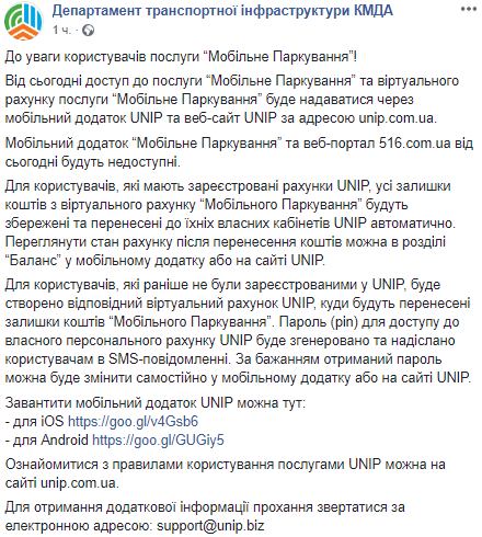 В сообщении говорится, что мобильное приложение "Мобильная парковка" и веб-портал 516.com.ua с сегодняшнего дня будут недоступны.