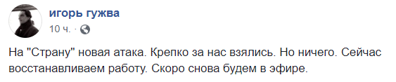 "На "Страну" новая атака. Крепко за нас взялись. Но ничего. Сейчас восстанавливаем работу. Скоро снова будем в эфире", - написал вчера в Facebook главный редактор издания Игорь Гужва.