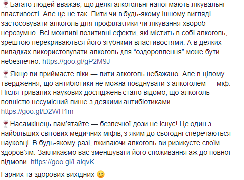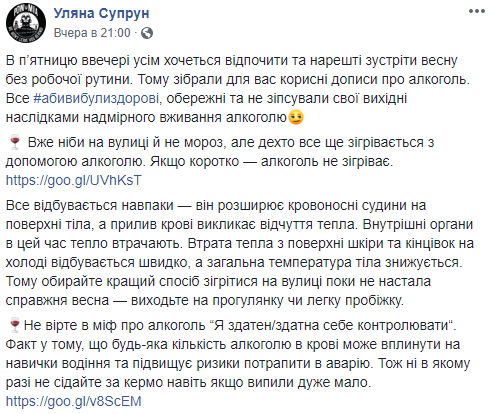 Глава Минздрава Ульяна Супрун, которая описала признаки выгорания на работе, развенчала мифы об алкоголе и открыла его секреты. Об этом она написала на своей странице в Facebook.