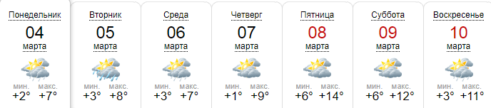 Сайт Укргидрометцентра обещает до +7...+9 в начале недели. В понедельник-вторник возможен дождь. В пятницу, 8 марта, будет по весеннему тепло: до +13...+15. Переменная облачность без осадков.