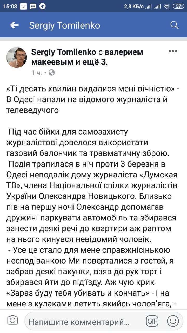 Появились подробности покушения на телеведущего и журналиста "Думской" Александра Новицкого в Одессе. Об этом сообщил глава НСЖУ Сергей Томиленко на своей странице в Facebook.