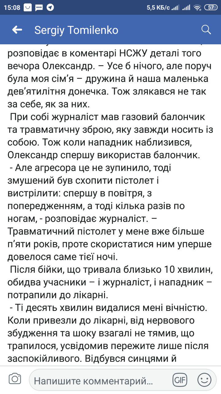 "Но агрессора это не остановило, тогда вынужден был схватить пистолет и выстрелить: сначала в воздух, с предупреждением, а потом несколько раз по ногам. Травматический пистолет у меня уже более пяти лет, однако воспользоваться им впервые пришлось именно той ночи", - рассказывает журналист.