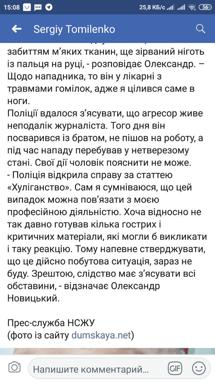 Нападающий попал в больницу с травмами голеней, ведь журналист целился именно в ноги. Полиции удалось выяснить, что агрессор живет неподалеку журналиста. В тот день он поссорился с братом, не пошел на работу, а во время нападения находился в нетрезвом состоянии. Свои действия мужчина объяснить не может. "Полиция открыла дело по статье "Хулиганство". Сам я сомневаюсь, что этот случай можно связать с моей профессиональной деятельностью. Хотя относительно недавно готовил несколько острых и критических материалы, которые могли бы вызвать и такую ​​реакцию. Поэтому наверняка утверждать, что это действительно бытовая ситуация, сейчас не буду. В конце концов, следствие должно выяснить все обстоятельства", - отмечает Александр Новицкий.