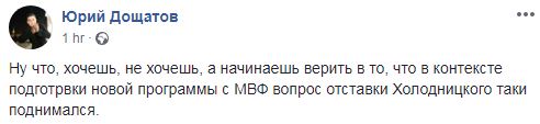 "Хочешь не хочешь, а начинаешь верить в то, что в контексте подготовки новой программы с МВФ вопрос отставки Холодницкого таки поднимался", - прокомментировал сообщение Йованович журналист Юрий Дощатов.