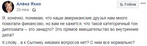 "Я, конечно, понимаю, что наши американские друзья нам много помогали финансово, но вам не кажется, что такой категоричный тон дипломата - это занадто? Это прямое вмешательство во внутренние дела? К слову , а к Сытнику никаких вопросов нет? С ним все нормально?", - задается вопросом Яхно.