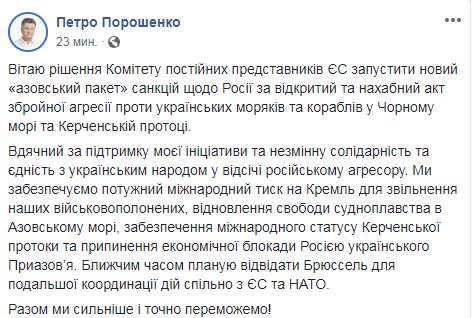 "Приветствую решение Комитета постоянных представителей ЕС запустить новый "азовский пакет" санкций в отношении России за открытый и наглый акт вооруженной агрессии против украинских моряков и кораблей в Черном море и Керченском проливе", - написал Порошенко.