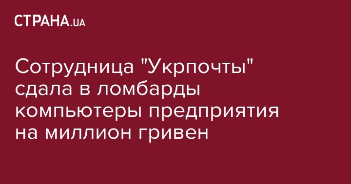 44-летняя жительница Ужгорода, являющаяся сотрудницей Закарпатской дирекции ПАО "Укрпочта", сдала в ломбарды компьютерное оборудование предприятия на общую сумму более 1 миллиона гривен. Об этом сообщается на сайте прокуратуры Закарпатской области.