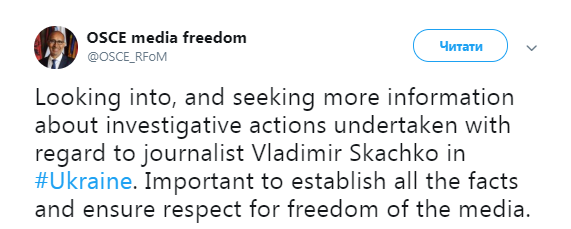 "Изучаю и собираю больше информации о следственных действиях в отношении журналиста Владимира Скачко в Украине. Важно установить все факты и обеспечить соблюдение свободы СМИ", - написал он в среду в Twitter.