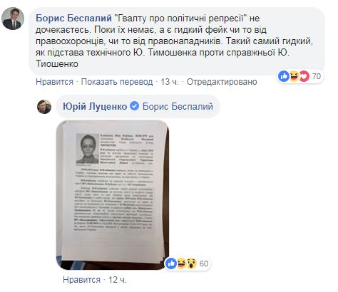 Фото было опубликовано в комментариях под постом Луценко о задержании по делу "о подкупе" кандидата Юрия Тимошенко в Facebook.