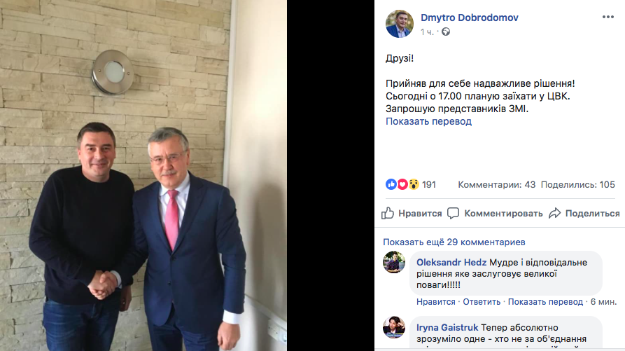 Кандидат в президенты Дмитрий Добродомов снимет свою кандидатуру с выборов в пользу Анатолия Гриценко.