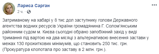 "Задержанному на взятке в 8 тыс. долл. заместителю главы Государственного агентства водных ресурсов Украины гражданину Г. Соломенский районный суд Киева сегодня избрал меру пресечения в виде содержания под стражей на два месяца с альтернативой внесения залога в пределах 130 прожиточных минимумов, что составляет 250 тыс. грн", - указано в опубликованном сообщении.