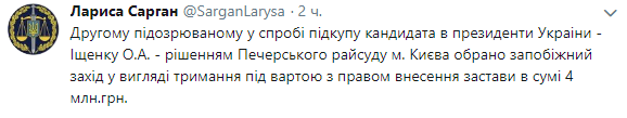 "Второму подозреваемому в попытке подкупа кандидата в президенты Украины - Ищенко А. А. - решением Печерского райсуда Киева избрана мера пресечения в виде содержания под стражей с правом внесения залога в сумме 4 млн грн", - отметила Сарган.