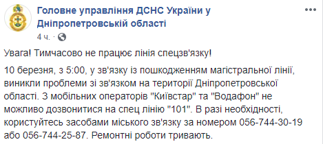 "Внимание! Временно не работает линия спецсвязи! 10 марта, с 05:00, в связи с повреждением магистральной линии, возникли проблемы со связью на территории Днепропетровской области. С мобильных операторов "Киевстар" и "Водафон" невозможно дозвониться на спец. линию "101". В случае необходимости, пользуйтесь средствами городской связи по номеру 056-744-30-19 или 056-744-25-87", - говорится в сообщении.
