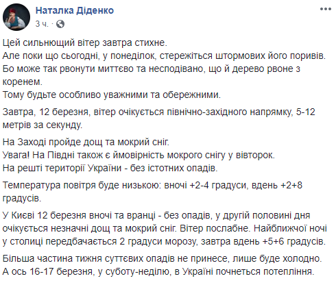 Во вторник, 12 марта, штормовой ветер, который срывает крыши с домов и валит деревья, стихнет. Об этом сообщила синоптик Наталья Диденко на своей странице в Facebook.