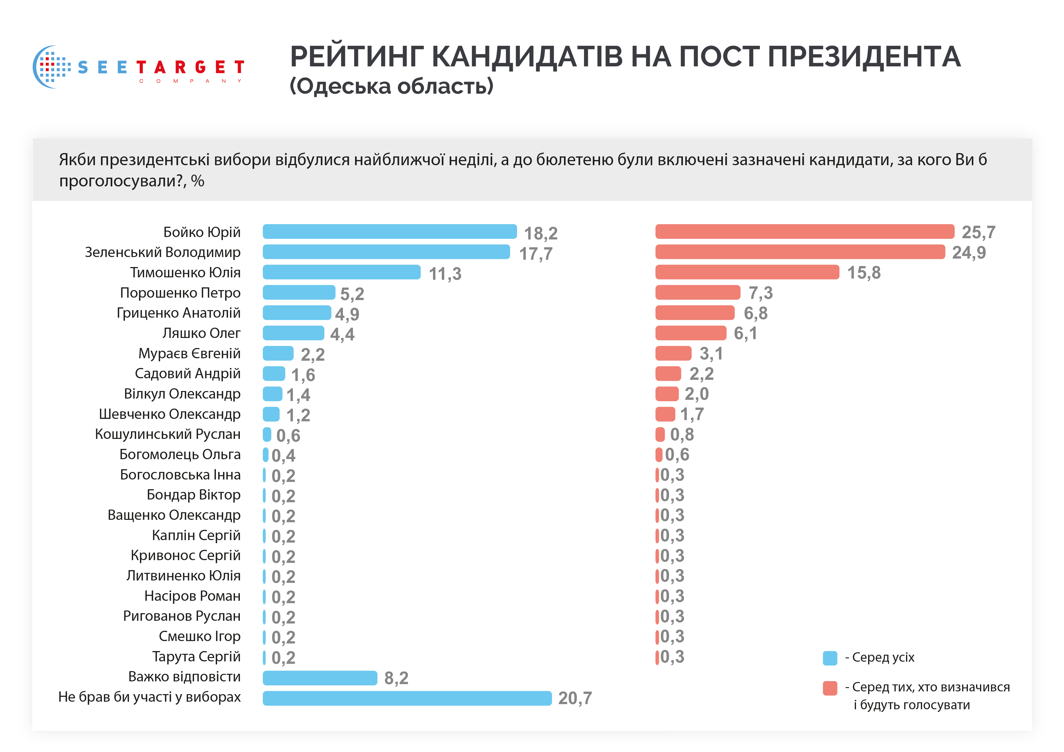 Согласно исследованию, за представителя "Оппозиционной платформы - За жизнь" Юрия Бойко готовы отдать свои голоса 25,7% избирателей Одесской области из тех, кто уже определились и будут голосовать. Зеленский находится на втором месте (24,9%), а Тимошенко на третьем (15,8%).