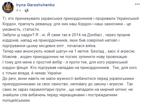 "Теперь нам анонсируют новый шатун на 1 апреля. Беспорядок, хаос и агрессию. Мол, ни один пограничник не посмеет остановить новую провокацию", - написала Геращенко. Она добавила, что выступает против тех, для кого "украинская граница - фикция". "Кстати, они даже не нашли мужества извиниться перед украинскими пограничниками за свое свинство, неуважение к закону и агрессию. Так же как сейчас парамилитарные группы, напавшие на мирный митинг, не нашли слов извинений перед жителями Черкасс и пострадавшими полицейскими", - подытожила вице -спикер.