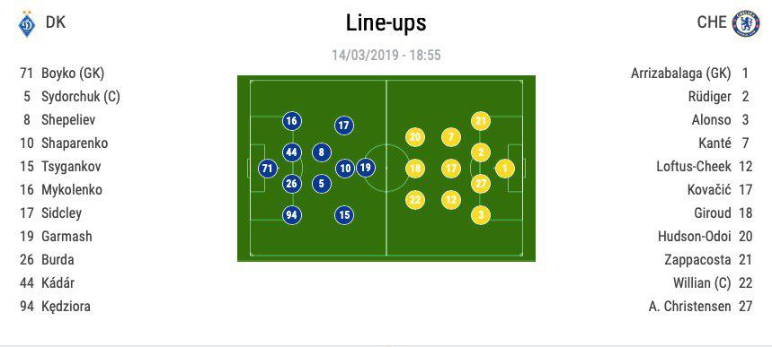 19:39 Футболисты "Динамо" выйдут на поле в домашней, белой форме. Гости из Лондона одеты в желтые цвета. Вратарь динамовцев Денис Бойко надел темно-зеленый комплект экипировки, а его коллега в "Челси" - в оранжевый.