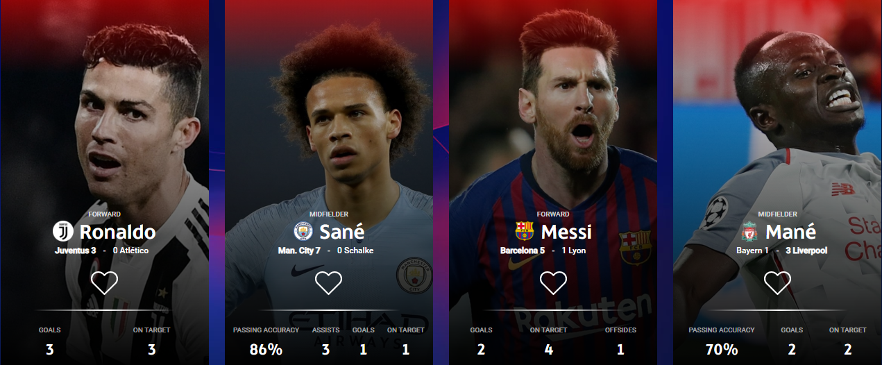 В список УЕФА на приз лучшему игроку недели в Лиге чемпионов вошли форвард Ювентуса Криштиану Роналду (хет-трик в матче с Атлетико), полузащитник Манчестер Сити Лерой Сане (гол и три ассиста в матче с Шальке), капитан Барселоны Лионель Месси (2 гола и 2 ассиста в матче с Лионом) и нападающий Ливерпуля Садьо Мане (дубль в матче с Баварией).