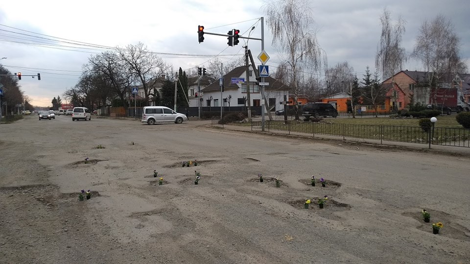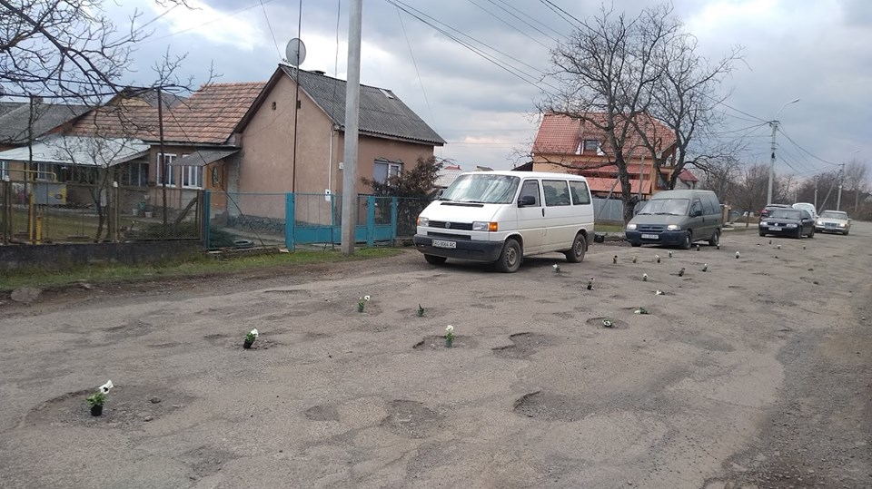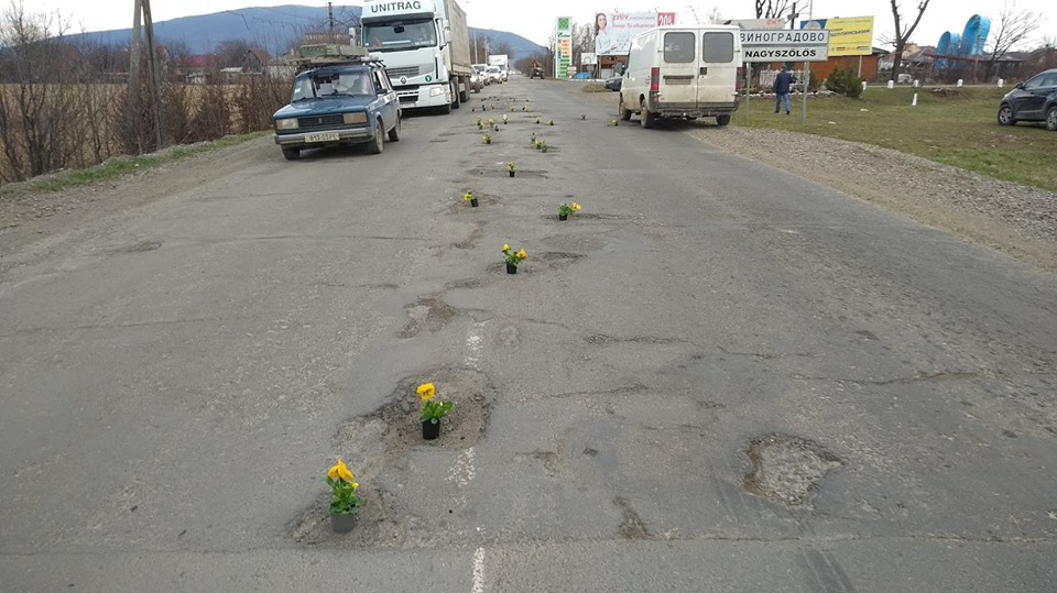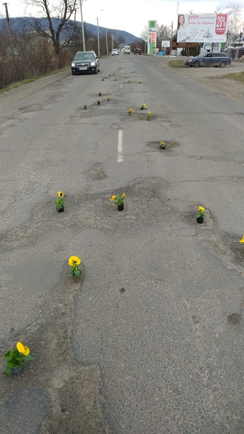 В городе Виноградове Закарпатской области по возможным маршрутам следования кортежа Порошенко в дорожных ямах установили цветы в горшочках. Так жители решили присоединиться к "областному благоустройству" Закарпатья, которое сегодня, 15 марта должен посетить Порошенко.