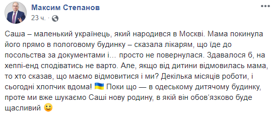 В Украину спустя год вернули рожденного в московском роддоме малыша Сашу, которого бросила мать-украинка. Возвращением ребенка занимались Одесская областная служба по делам детей, полиция и посольство Украины. Об сообщает губернатор области Максим Степанов на своей странице в Facebook.