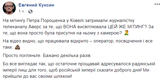 "На митинге Петра Порошенко в Ковеле задержали журналистку телеканала Аверс за то, что она освещала этот же митинг? За то, что она просто присутствовала на нем с камерой? На видео видно, что работала открыто - оператор, удостоверение и все такое. Просто посмотрите. Желательно несколько раз. Потому что все выглядит так, будто "остаточне прощавай" адресовалось только советской империи лишь для того, чтобы российской империи сказать доброго дня! Мы пришли к вам своими путем!", - рассказал Евгений Куксин.