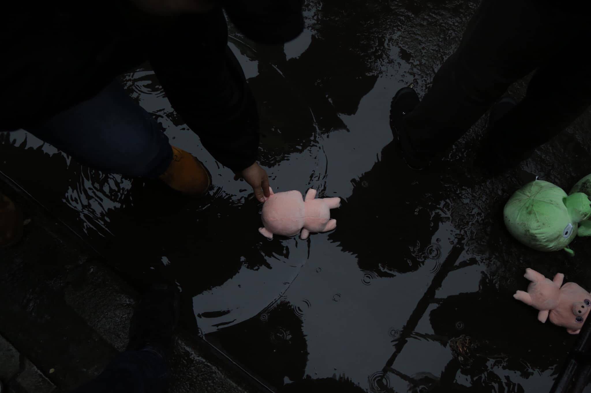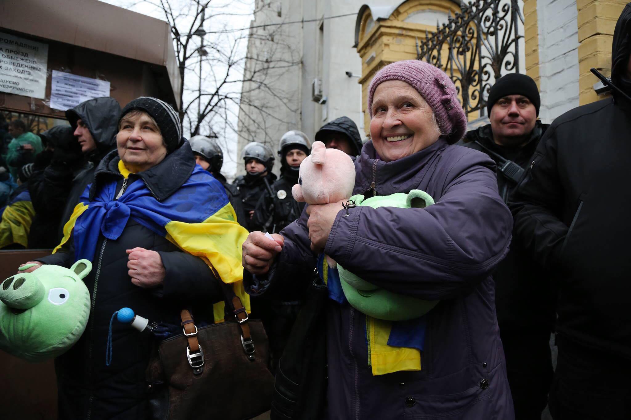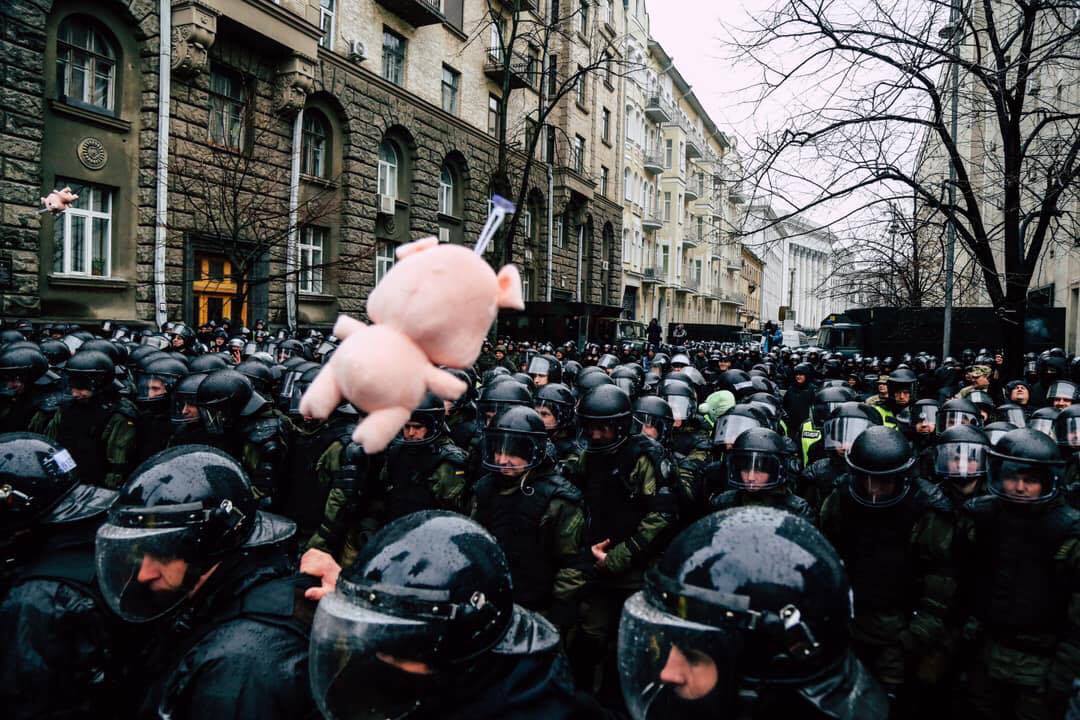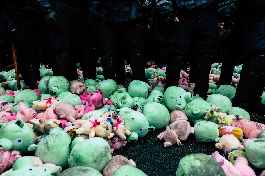 Возле здания Администрации Президента всем желающим раздали плюшевых свиней - в напоминание об Олеге Гладковском, настоящая фамилия которого - Свинарчук. Также активисты принесли к АП огромную рогатку и под музыку из игры Angry Birds обстреляли из рогатки свиньями  полицейских и АП.