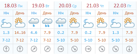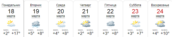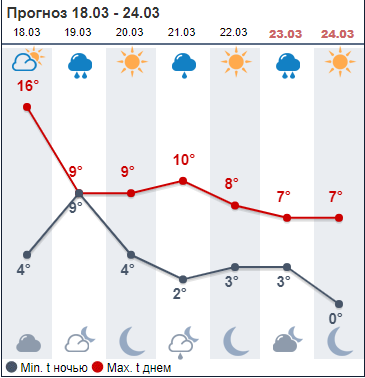 Ресурс Мeteoprog.ua показывает 18 марта тепло до +16. Потом похолодает до +7...+10. Во вторник, четверг и субботу возможен дождь.