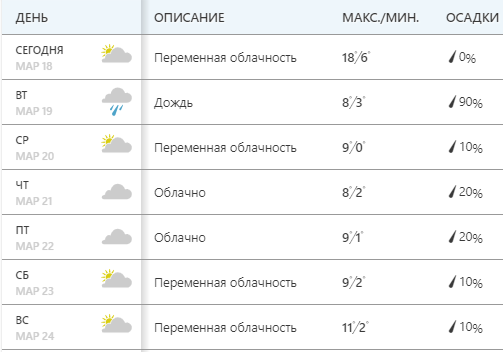Сайт Weather.com сообщает, что в понедельник будет по-весеннему тепло: до +18. Затем обещают +8...+10 днем. Что касается осадков, то этот ресурс прогнозирует дождь только во вторник, 19 марта.