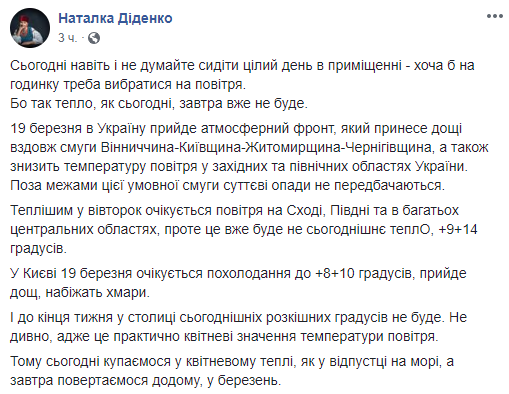 Синоптик ресурса Opogode Наталья Диденко также пишет, что в понедельник нужно хотя бы на пару часиков выглянуть на улицу и прогуляться под теплым солнышком, ведь уже 19 марта в Украину придет атмосферный фронт, который принесет похолодание и снижение температуры. Осадки пройдут полосой в Винницкой, Житомирской, Киевской и Черниговской областях. При этом в Киеве температура будет +8...+10, а вот на юге и востоке воздух прогреется до +9...+14.