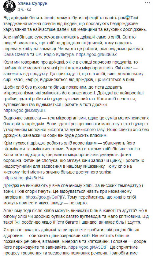 И.о. министра здравоохранения Ульяна Супрун рассказала украинцам о пользе и вреде хлеба на дрожжах для организма человека, а также развеяла мифы не только о хлебобулочных изделиях, но и о самих дрожжах. Соответствующий пост размещен на странице министра в социальной сети Facebook.