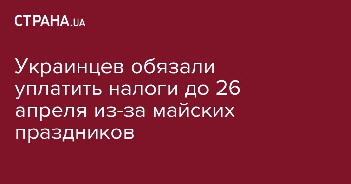 Украинцы должны уплатить налоги до 26 апреля в связи с переносом рабочих дней на майские праздники. Об этом сообщает пресс-служба Государственной фискальной службы.