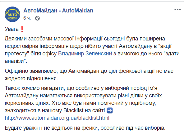 "Некоторыми средствами массовой информации сегодня была распространена недостоверная информация о якобы участии Автомайдана в "акции протеста" возле офиса В.Зеленского с требованием к нему "сдать анализы". Официально заявляем, что Автомайдан к этой фейковой акции не имеет никакого отношения", - говорится в сообщении.