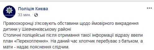 В столичной полиции заявили в Facebook, что правоохранители выясняют обстоятельства относительно вероятного похищения ребенка в Шевченковском районе. "В настоящее время мальчик находится с отцом, а мать - дает объяснения следователям", - пояснили там.