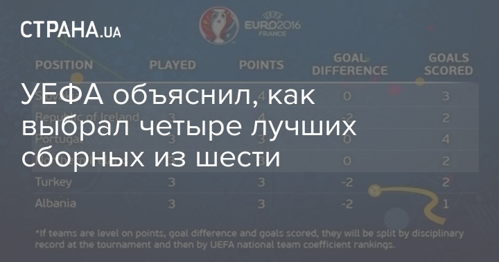 Европейский Союз Футбольных Ассоциаций (УЕФА), который впервые в истории проводит чемпионат Европы по футболу с участием 24 команд, разъяснил, как именно выбрал четыре лучших сборных из шести, которые заняли третьи места в своих группах.