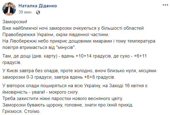 "Надо защитить нежные ростки нового весеннего цвета. Заморозки бывают ежегодно, главное, знать об их приходе. Греемся. Стоим", - написала Наталья Диденко в соцсети.