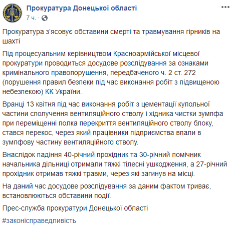 В частности, в результате инцидента 40-летний проходчик и 30-летний помощник начальника участка были тяжело травмированы, а 27-летний проходчик получил несовместимые с жизнью травмы, из-за которых скончался на месте происшествия. Под процессуальным руководством Красноармейской местной прокуратуры проводится досудебное расследование по признакам уголовного преступления, предусмотренного ч. 2 ст. 272 (нарушение правил безопасности во время выполнения работ с повышенной опасностью) УК Украины.