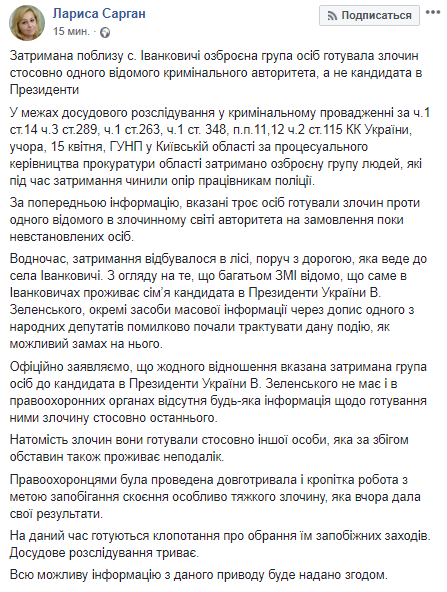 "В то же время задержание происходило в лесу, рядом с дорогой, ведущей в село Иванковичи. Учитывая то, что многим СМИ известно, что именно в Иванковичах проживает семья кандидата в президенты Украины Владимира Зеленского, отдельные средства массовой информации из-за сообщения одного из народных депутатов ошибочно начали трактовать данное событие, как возможное покушение на него", - написала Сарган.