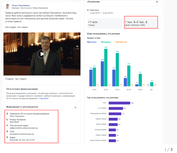 Благодаря тому, что Facebook раскрыл данные о заказчиках политической рекламы в соцсети, журналисту Евгению Спирину удалось узнать, что рекламные аккаунты, с которых запускалось продвижение на официальной странице Порошенко и в пабликах, публикующих антирекламу Владимира Зеленского и других соперников президента в первом туре, привязаны к одному и тому же номеру телефона. Он принадлежит сотруднице украинского цифрового агентства Postmen.