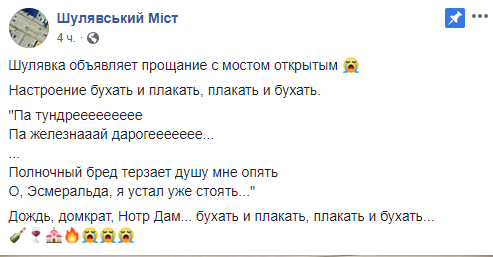 "Шулявка объявляет прощание с мостом открытым. Настроение бухать и плакать, плакать и бухать. "Па тундрееееееееее Па железнааай дарогеееееее... Полночный бред терзает душу мне опять. О, Эсмеральда, я устал уже стоять. Дождь, домкрат, Нотр Дам... бухать и плакать, плакать и бухать...", - написали на странице в социальной сети, пытаясь описать чувства, которые мог бы испытывать Шулявский путепровод.