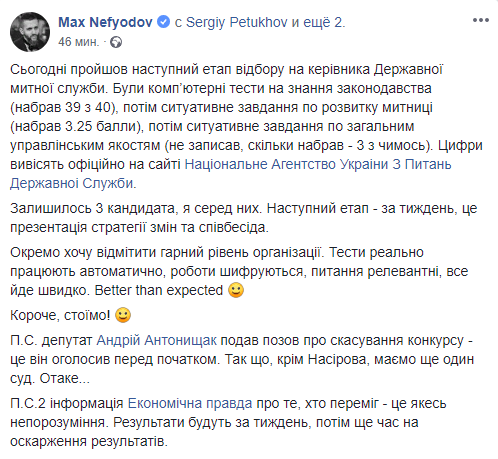 "Сегодня прошел следующий этап отбора на руководителя Государственной таможенной службы. Были компьютерные тесты на знание законодательства (набрал 39 из 40), потом ситуативное задачи по развитию таможни (вступил 3.25 балла), затем ситуативное задания по общим управленческим качествам (не записал, сколько набрал - 3 с чем-то)", - написал он.