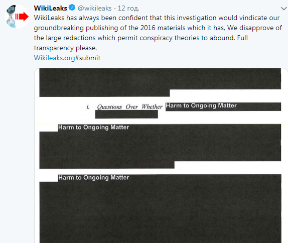 После того, как Минюст США 18 апреля опубликовал доклад спецпрокурора Мюллера о вмешательстве России в выборы 2016 года, портал Wikileaks заявил, что документ содержит значительные купюры и призвал власти обнародовать полную версию отчета спецпрокурора.