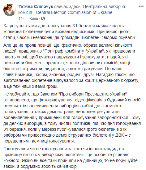 "Поэтому действия некоторых избирателей, в том числе и политиков, во время голосования 31 марта, когда в сети публиковались фото бюллетеней с их выбором или публично демонстрировались бюллетени в УИК - нарушение тайны голосования", - сообщила Слипачук.